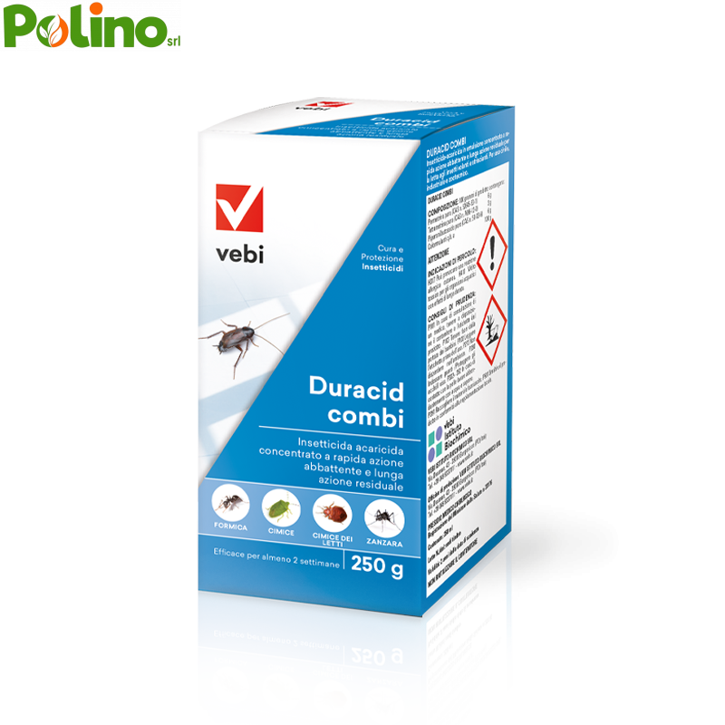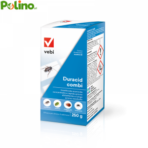 DURACID COMBI è un insetticida che associa una duplice azione: l’elevata efficacia immediata della Tetrametrina libera e la prolungata azione residuale della Permetrina, che garantiscono ambienti liberi da insetti per almeno due settimane dal trattamento. Entrambi i principi attivi sono sinergizzati con l’alta quantità di Piperonlibutossido (PBO), che ne facilita la penetrazione negli insetti, riduce le resistenze e ne aumenta l’efficacia. DURACID COMBI è efficace contro gli insetti volanti (mosche, tafani, vespe, zanzare comuni e zanzare tigre, pappataci, flebotomi, moscerini), striscianti (blatte, formiche, pulci e cimici) e gli infestanti dei magazzini (tignole, punteruoli del grano e Triboliu,), oltre che verso altri animali, come ragni, zecche, pidocchio pollino, alfitobio (Alphitobius diaperinus), cimici dei letti e altri invasori occasionali.