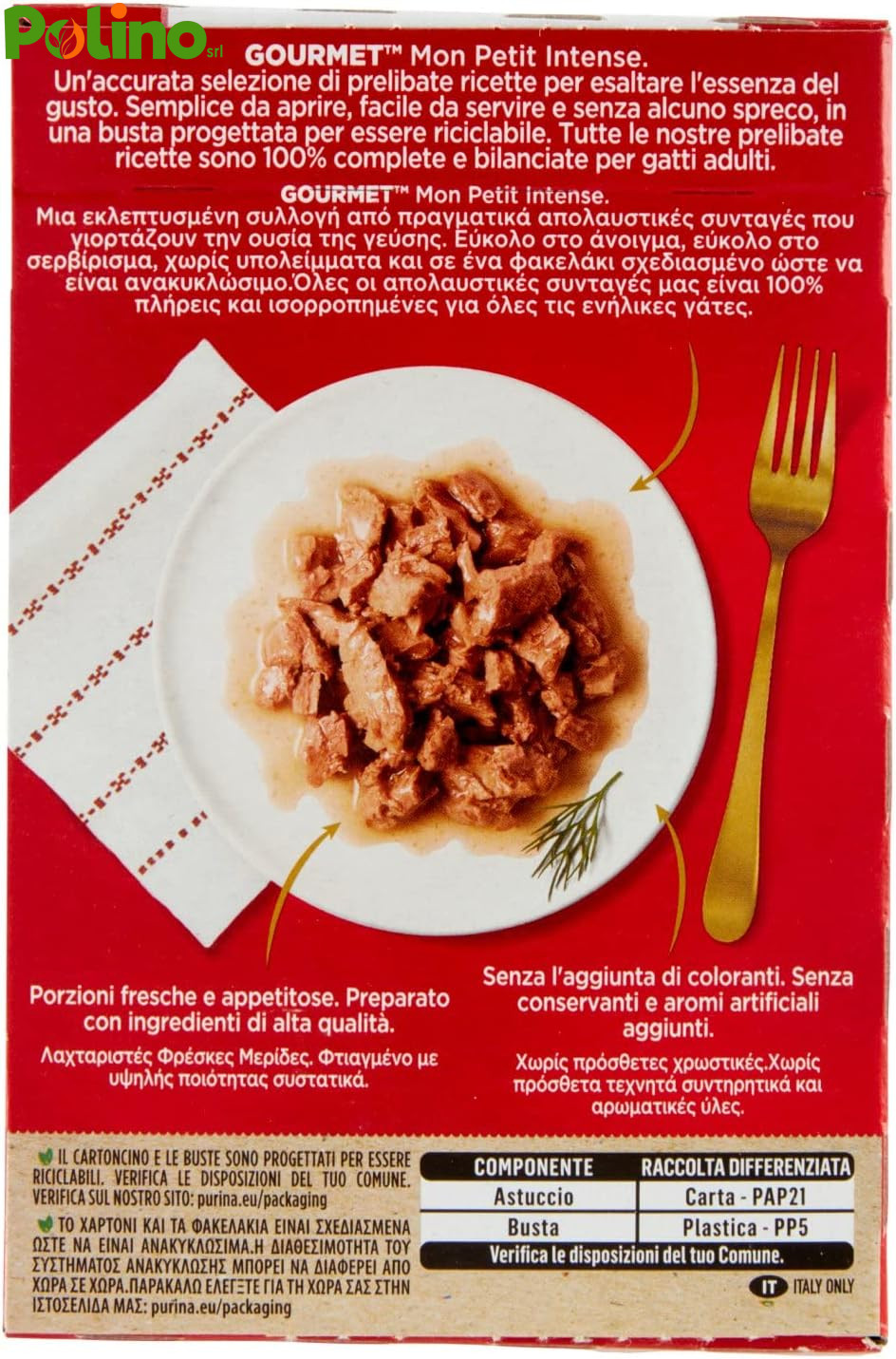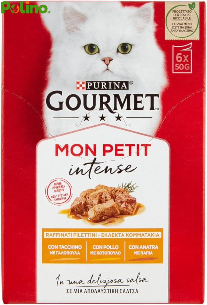 Cibo per gatti Purina Gourmet Mon Petit Intense con Carni Delicate. Selezione prelibata con carne di Anatra, Pollo e Tacchino.